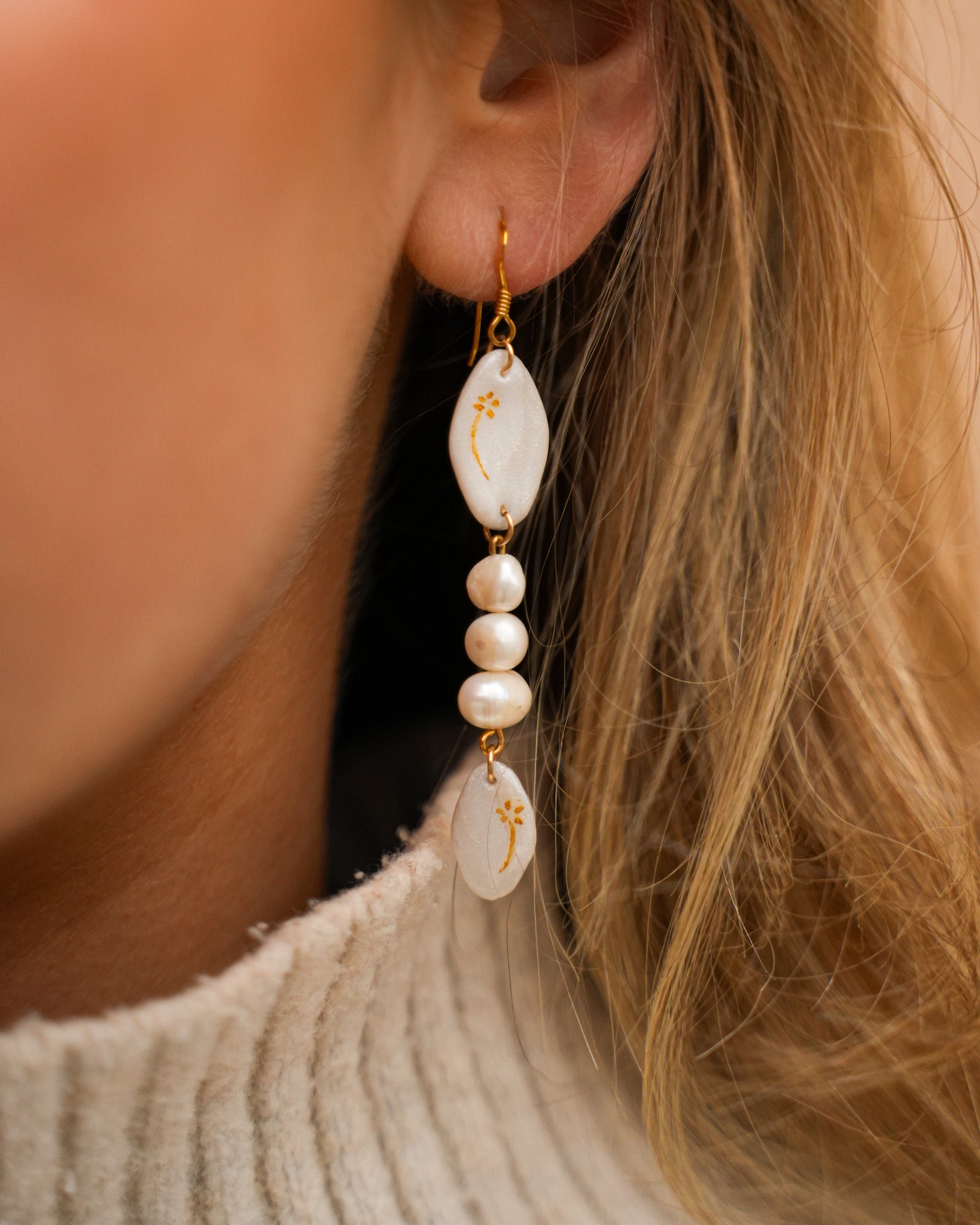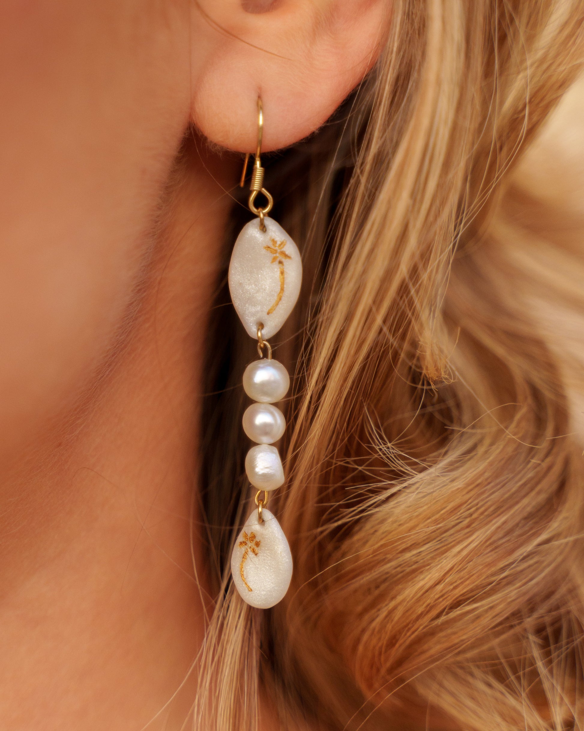 Disse unike, håndlagde øredobbene er laget av polymerleire og utsmykket med elegante ferskvannsperler. Hvert par er håndmalt med akrylmaling.