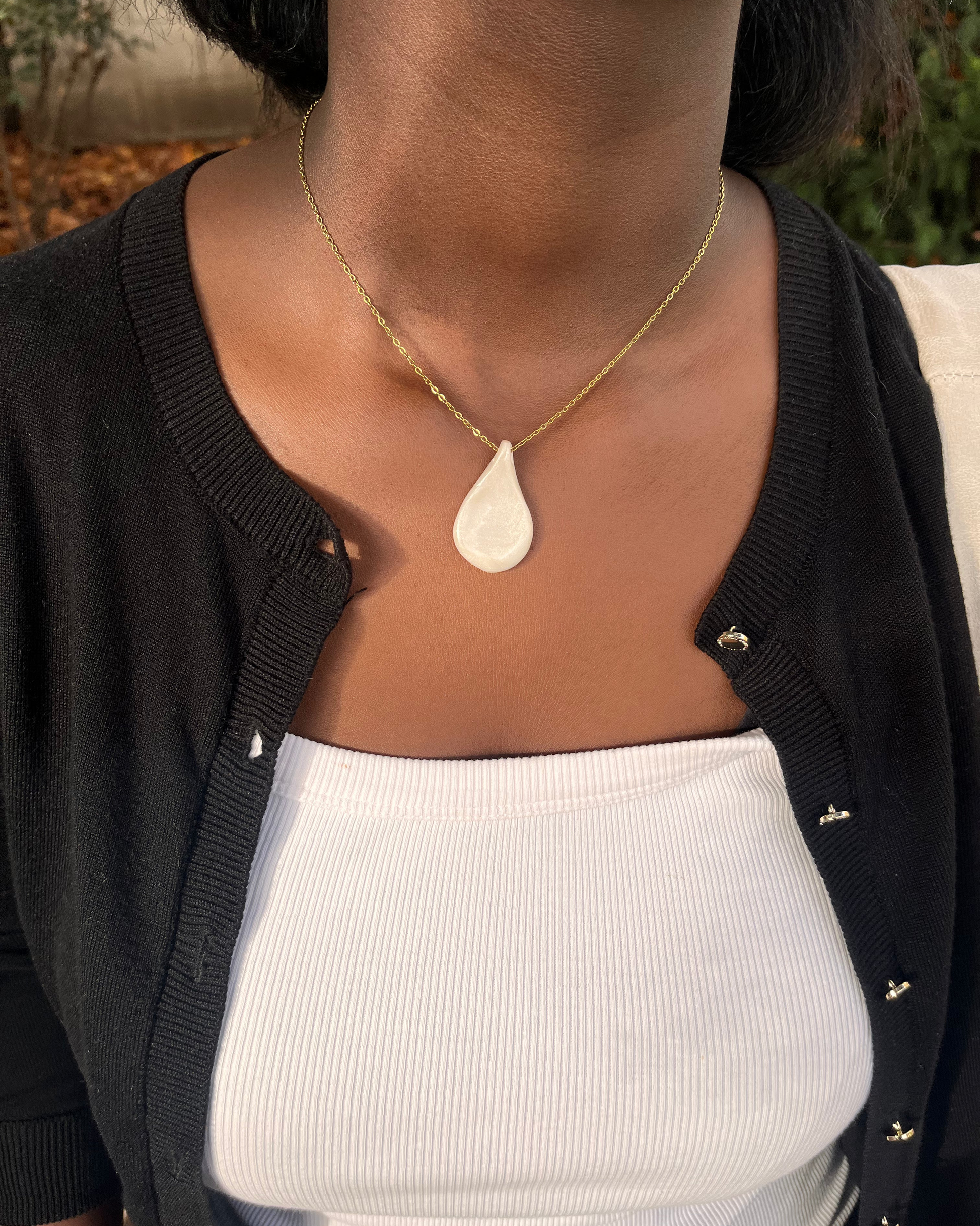 Vi introduserer SOLFRID-halskjedet, oppkalt etter vår bestemor. Et delikat smykke håndlaget i leire, formet som en elegant dråpe.